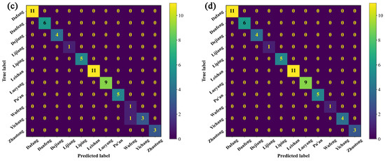 Confusion matrices: (a) PLS-DA, (b) KNN, (c) SVM, and (d) 1D-CNN.