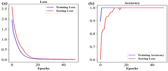 The loss and accuracy curves of the training set and testing set can diagnose any issues that could be causing underfit or overfit models during the learning process [44]. If the model is overfitting, the loss curve will gradually decrease on the training set, but it may stabilize or start to increase on the testing set. The accuracy of the model on the training set may approach 100%, while it may decrease or stabilize on the testing set. If the model is underfitting, both the loss curve on the training set and the testing set may fail to reach a low level, and the difference between them may be small. The accuracy of the model on both the training set and the testing set may be low, with a small difference between them. As a result, the 1D-CNN model was trained with an initial learning rate of 0.01, 50 iterations (epoch = 50), and a batch size of 32 (batch_size = 32) in this study. From Figure 7a, it can be observed that as the number of training iterations increased, the loss function of the 1D-CNN model for both the training set and testing set gradually decreased, indicating that the model was finding spectral features related to the origin of G. elata. When the loss function was very low, the loss curve decreased significantly and became flat as it approached zero. At this point, the 1D-CNN model became more stable, and the losses of the training set and testing set both converged, with a small difference between them, indicating successful fitting. Figure 7b shows that the accuracy curve of the 1D-CNN model on both the training set and testing set approached 1 (or 100%), indicating optimal model performance.