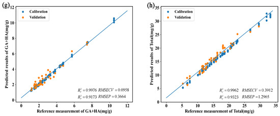 Graphical relationships between reference values and predicted values of the optimal calibration models for (a) gastrodin (GA); (b) p-hydroxybenzyl alcohol (HA); (c) parishin E (PE); (d) parishin B (PB); (e) parishin C (PC); (f) parishin A (PA); (g) the sum of gastrodin and p-hydroxybenzyl alcohol (GA + HA); and (h) the sum of gastrodin, p-hydroxybenzyl alcohol, parishin E, parishin B, parishin C, and parishin A (total).