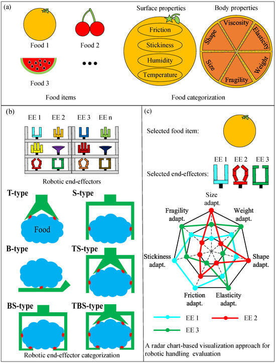Food handling using the evaluation system of robotic end-effectors: (a) food categorization, (b) robotic end-effector categorization, and (c) food-categorization-based scoring and radar chart-based visualization approach for robotic handling evaluation.