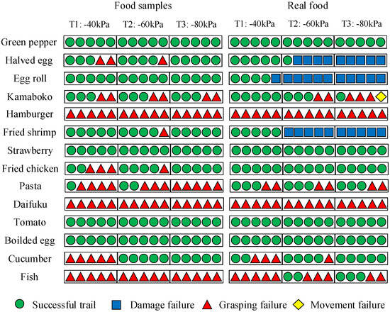 Consider EE 5; the results are shown in Figure 3. T1, T2, and T3 represent the three different air pressures used in the experiments. Successful trials (indicated by green circles) indicated that the food item was stably picked up and placed at the desired location. Otherwise, the trial was considered a failure, and the reasons were divided into three different types: (1) grasping failure, in which the food item could not be picked up (red triangle); (2) damage failure, in which the food item was damaged (blue square); and (3) movement failure, in which the food item was dropped during the transporting motion (yellow diamond). Figure 3 shows that EE 5 succeeded in all trials for both the sample and real tomato, but failed 11 times in grasping the real egg roll owing to damage. In addition, EE 5 failed all trials in grasping the hamburger because it was large and it did not fit in the EE 5’s grasp. Interestingly, Figure 3 also shows that EE 5 succeeded in a few trials when handling real fish, but failed in all trials in grasping the fish sample owing to the heavy weight of the sample. The figure provides information of how the end-effector handles various food items.