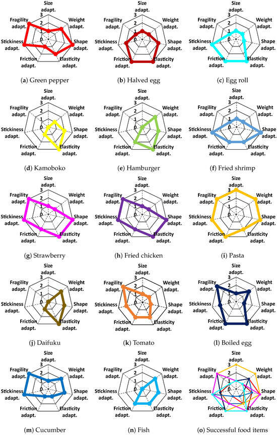 Following the scoring approach proposed in Section 2.4, scores were calculated for each end-effector handling each food item. The results were visualized using a radar chart. Figure 4 shows the evaluation results of EE 5 when handling 14 real food items. We can see that EE 5 failed to handle kamoboko, hamburgers, daifuku, and fish for different reasons. For successful food items, EE 5 can cover a large variety of food properties, as shown in Figure 4o.