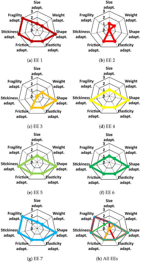 Figure 5 shows the evaluation results of the seven soft end-effectors for handling the same food item (real fried shrimp). We found that EE 4, EE 5, and EE 6 performed well in handling the fried shrimp. Furthermore, EE 1 and EE 7 performed better than EE 4, EE 5, and EE 6 because they had better adaptability to fragility. However, EE 2 and EE 3 failed to grasp the fried shrimp because of the shape of EE 2 and size of EE 3, as indicated in Figure 5b,c, with the corresponding vertices located at the center of the radar charts.