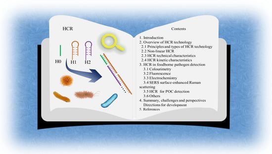In this review, the development of food safety detection technologies (especially for foodborne pathogens) is first briefly described. The basic principles, types, and technical characteristics of HCR are then described. Finally, the application of HCR amplification techniques for detecting foodborne pathogens over the last five years is discussed, with a focus on specific examples, summarized in Table 1. In general, the excellent amplification capabilities of HCR are demonstrated by the use of various signal transduction platforms [100] (e.g., fluorescent, colorimetric, electrochemical, etc.), which enable the sensitive detection of various markers (DNA, 16S rRNA, Cell) of pathogenic bacteria. Although HCR amplification technology has led to a significant increase in the sensitivity of the detection of foodborne pathogens, it has been accompanied by severe challenges.