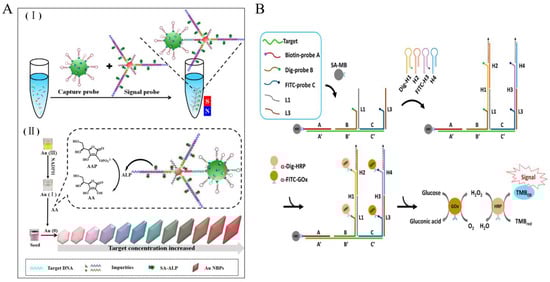 Tang et al. reported a high-color-resolution and ultrasensitive detection biosensor [38] for the detection of methicillin-resistant Staphylococcus aureus (mecA gene) in milk based on the multi-HCR of AuNPs and the alkaline phosphatase (ALP)-mediated in situ growth of gold nanobipyramid particles (AuNBPs) (Figure 3A). In the presence of target DNA, it acts as a linking bridge to hybridize magnetic capture probes (CP) and AuNP signal probes (SP), carrying plenty of ALP. With the assistance of NADPH, a series of rainbow-colored results of the in situ growth of AuNBPs with different concentrations of target DNA are observed. This method can detect as low as 2.71 pM target DNA through multi-step amplification of AuNP vectors, multi-HCR amplification, and enzymatic reactions. Importantly, the multiple color output results are easy to determine visually.
