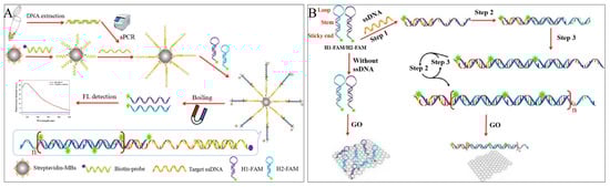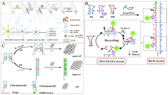 Apart from MBs, the two-dimensional nanomaterial—graphene oxide (GO) [45] is commonly preferred for its excellent fluorescence quenching properties for most fluorescent dyes, fluorescent groups, quantum dots, and metal fluorescent nanoclusters. In addition, it has been cleverly used as an adjunct to fluorescence strategies in HCR technology due to its different affinity for ssDNA and dsDNA and as an “HCR-GO” platform to reduce background values or restore fluorescence signals. Yu et al. proposed a fluorescence “turn-on” strategy based on the “HCR-GO” platform [44]. Initially, the hairpin single strands were quenched by GO, and fluorescence was turned off. When Salmonella ssDNA was present, HCR was triggered by the alternating hybridization of H1-FAM and H2-FAM to form a long dsDNA nanowire, which detached from the GO surface and restored fluorescence. The detection of Salmonella ssDNA was completed within 3.5 h, with a detection limit of 4.2 × 101 CFU/mL in buffer and 4.2 × 102 CFU/mL in milk (Figure 4B).