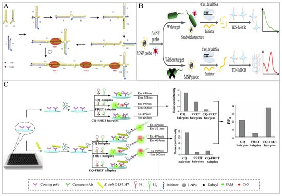 CQ is another fundamental mechanism of fluorescence energy transfer. When the fluorescent group and the quencher are in proximity in this system, the energy of the fluorescent group can be transferred to the quencher through proton-coupled electron transfer, leading to fluorescence contact quenching [55]. As the distance between them increases, the fluorescence on the fluorescent group can be restored, resulting in a fluorescent signal. The Lai group coupled CQ and ratio FRET through HCR technology, proposing a sandwich ELISA method for the detection of E. coli O157:H7 in milk. They designed a low-background HCR hairpin probe (CQ-FRET probe) to investigate a more sensitive and accurate FRET output strategy [54]. The detection limit of this CQ-FRET method was 3.5 × 101 CFU/mL, significantly lower than that of the CQ hairpin-based immune HCR (3.28 × 103 CFU/mL) and the FRET hairpin-based immune HCR (6.49 × 104 CFU/mL), which were 93-fold and 1854-fold higher, respectively. But there is no doubt that it also increases costs and expenses (Figure 6C).