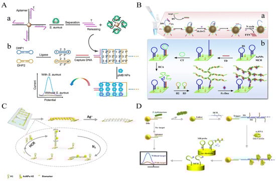 In addition, Feng et al. cleverly exploited the characteristics of HCR-grown linear DNA nanowires to propose a simple and novel electrochemical scheme of simple synthetic silver wires between electrodes to detect S. aureus 16S rRNA in milk [71]. In the presence of 16S rRNA, the modified sub-stable hairpin probe H1 on the electrode surface opened, activating HCR. The stem-loop structures of H1 and the hairpin probe H2 modified with AuNPs (H2-AuNPs) alternately opened to finally form a long dsDNA-RNA (HCR product)-AuNPs product. Under the influence of N2 cycles, the modified HCR product of the AuNPs was tiled in the electrode gap to form a framework, and silver was deposited on the AuNP of the extended ladder product between the electrodes to form silver wires, leading to a drastic change in electrical parameters. This method achieved a detection limit of 50 CFU/mL within 50–107 CFU/mL of S. aureus, with a total time of 100 min (Figure 7C).