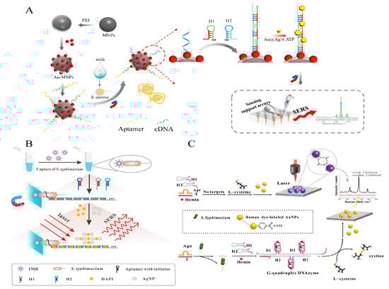 Li et al. instead proposed an indirect SERS strategy for the susceptible detection of S. Typhimurium in milk [81]. The HCR product was loaded with many Raman signal molecules DAPIs separated by IMB. Finally, the remaining DAPIs emitted a dense SERS signal due to electrostatic interactions with colloidal AgNP absorption and the formation of many hot spots. The results showed a detection limit of 6 CFU/mL within 3.5 h (Figure 8B).