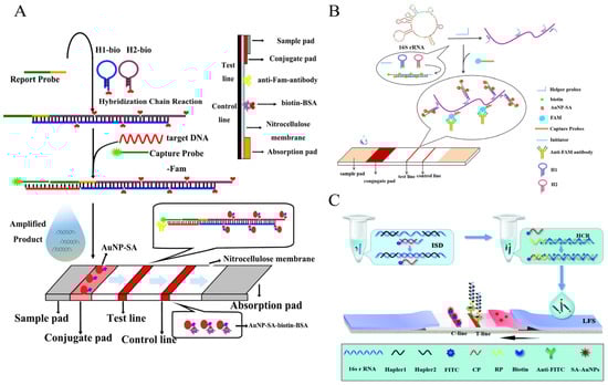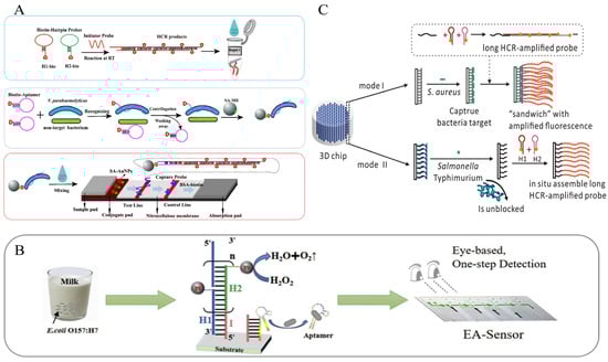 Subsequently, Fang’s team investigated the extension of the application of other detection targets for foodborne pathogens based on the HCR-LFA strategy. Due to the tens of thousands of copies of 16S rRNA in individual bacterial cells, targeting them has a potential amplification effect. In 2020, Fang’s team proposed the HCR-LFA method for detecting S. enteritidis 16S rRNA in milk (Figure 9B). Probe hybridization was improved by dissociation of the secondary structure of 16S rRNA by multiple Helper probes. The method provides sensitive detection of S. enteritidis with a detection limit of 53.65 CFU/mL. At the same time, it solves the problem that immunoassays or DNA amplification-based methods cannot distinguish between live and dead bacteria [84]. However, to avoid cross-contamination, Wan’s team proposed an HCR-LFA strategy based on opening the 16S rRNA hairpin with the aid of an auxiliary probe and following an isothermal chain displacement reaction (ISD), thereby achieving displacement of the 16S rRNA [85] (Figure 9C).