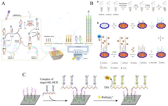 Li et al. proposed an ultrasensitive electrochemical biosensor based on 3D DNA Walker, RCA, and HCR multiplex amplification [70]. By generating dendritic DNA products by HCR, the spatial site resistance problem, often present in electrochemical receptors, is avoided. This assay demonstrated high sensitivity to the target DNA, with a 7 CFU/mL LOD (Figure 7B).