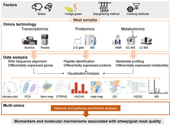 Omics utilizes high-throughput approaches to generate big data. In the post-genomic era, it consists of transcriptomics, proteomics, and metabolomics used to profile RNAs, proteins, and metabolites, respectively. Multi-omics is based on bioinformatics analysis to screen out differential expressions in big data and predict potential biomarkers. The data quality is examined before cluster analysis is used to correlate the omics data with biological phenotypes, predict functions, and map the related pathways. Interaction networks are also constructed to predict the relationships between RNAs, proteins, and metabolites [68]. Gene expression is influenced by various factors that determine the meat quality potential. However, the phenotype undergoes multiple processes, including transcription, translation, post-translational modification, and metabolism. An integrated omics strategy combining transcriptomics, proteomics, and metabolomics can help explore the expression changes during these processes, unraveling the molecular mechanisms responsible for meat quality variations. The workflow of multi-omics analysis for sheep and goat meat quality research is outlined in Figure 2.