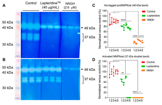 3.4. Gelatin Zymography Assessment of LepteridineTM and Its Ability to Inhibit His-Tagged proMMP-9cat and MMP-9cat Activity