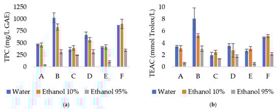 (a) Total phenolic compounds (TPC) on simulant media expressed in mg/L gallic acid equivalent. (b) Antioxidant activity in simulant media expressed in mmol Trolox equivalent/L simulant. SA—sodium alginate films; OLE—olive leaves extract; LLE—laurel leaves extract; A—SA + LLE 1%, B—SA + LLE 2%, C—SA + OLE 1%, D—SA + OLE 2%, E—SA + LLE 0.5% + OLE 0.5%, F—SA + LLE 1% + OLE 1%.