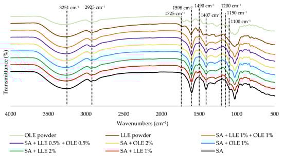 The FTIR spectra of OLE and LLE extracts and SA films containing LLE and OLE are shown in Figure 4.