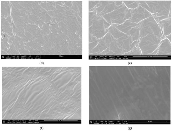SEM surface images of SA films incorporated with OLE and LLE. (a)—SA; (b)—SA + OLE 1%; (c)—SA + OLE 2%; (d)—SA + LLE 1%; (e)—SA + LLE 2%; (f)—SA + OLE 0.5% + LLE 0.5%; (g)—SA + OLE 1% + LLE 1%. Magnification 2500 × and scale bar 50 μm. SA—sodium alginate films; OLE—olive leaves extract; LLE—laurel leaves extract.