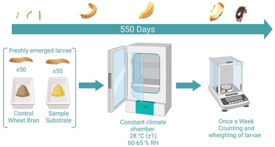 Tenebrio molitor larvae were obtained from a colony which had been reared since 2019 at the University of Applied Sciences (FH JOANNEUM GmbH, Graz, Austria). This colony was originally obtained from “abc-a better choice GmbH” on the 30 January 2019. All specimens were kept in a climate chamber at 27–29 °C with a relative humidity of 60–65% (KBF-S, WTC Binder GmbH, Tuttlingen, Germany). As recommended [21], specimens were kept in constant darkness. Freshly emerged larvae were raised in 100% wheat bran for 21 ± 2 days (depending on the eclosion time) and were then transferred to the different substrates (in earlier stages the mortality rate is too high to obtain valid results, cf. [2]). Before the start of the feeding experiments, all larvae were starved for 24 h. For the feeding trials, two boxes—8 × 8 × 5 cm for larvae and 15 × 8 × 5 cm for adult beetles (Curver® Luxembourg)—of each diet were stocked with 50 individuals of T. molitor (two boxes per substrate in most cases). Pupae were transferred to ice cube trays and reared individually until adult emergence under the same environmental conditions as larvae and beetles. At the beginning of the experiments, 2–18 g (depending on the density) of each substrate was placed in each of the plastic boxes. All cultivation boxes containing the different substrates were stored in the same climate chamber under the same rearing conditions. Twenty-nine substrates were tested and thirty-one different feeding experiments were conducted (WBc = wheat bran with the addition of carrots; LSWBc = second strain of T. molitor obtained from “dieWurmfarm”, Carinthia, Austria). Carrots were provided three times per week. Larvae were allowed to feed ad libitum and fresh feed was provided weekly to avoid accumulation of feces and contamination of frass. The frass was separated from the remaining food by using different sieves. Substrates were placed in the climate chamber for 24 h (conditions see above) prior to use. Boxes were visually evaluated five times per week to check larval health, to determine mortality, and to remove dead individuals. Once per week all specimens were separated from the feeding substrate, counted, and weighed individually. An additional water source is essential to increase the fecundity and longevity of T. molitor and thus, 0.1 to 0.2 mL of water was provided with a pipette twice a week to each box. Figure 1 illustrates the setup of the feeding experiments.