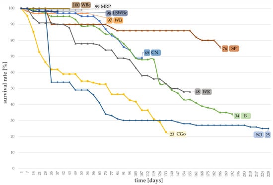 Larval survival compared among different successful substrates, determined daily, and given in percent until the first pupa was observed (WB, MRP, CGo, CN, B, SO, WK: n = 100; LSWBc, WBc, SP: n = 50).