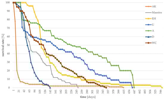 Larval survival in percent over time, determined daily, for different “improvable” substrates. (n = 100 for AK, EH, U, A, D, WC, and n = 50 for Maestro).