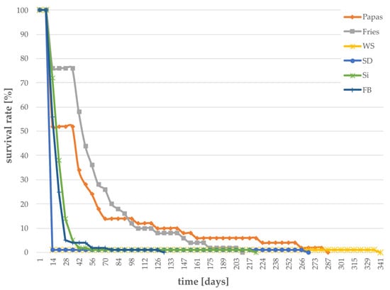 Larval survival in percent for different “not recommended” substrates with data for larvae surviving > 200 days. (n = 100 for WS, SD, Si, FB, and n = 50 for Papas, Fries). Survival was determined daily until all larvae were dead.