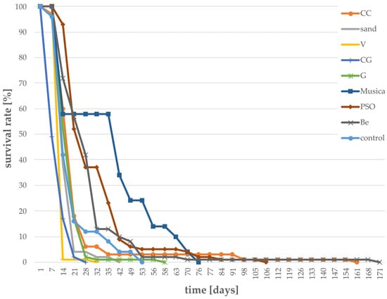 High mortality was furthermore observed for individuals reared on the following eight substrates: CC, PSO, Musica, Be, G, CG, V, and sand (Figure 5), with an overall survival period of less than 200 days. Within the first month, the survival rate of individuals fed with CC, sand, V, CG, and G was <10%. The “control” group (with no food provided) survived for 53 days, with a vast increase in mortality after day 13. Regarding CC, G, sand, V, and CG, the mortality was even higher as compared to the control group, indicating harmful contents in these substrates.