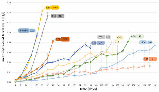 Mean individual weight of larvae (determined weekly) reared on different substrates shown until the first pupa emerged. (WB, B, SO, WK, CGo, CN, MRP: n = 20; SP, LSWBc, WBc, n = 10).