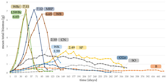 The mean total biomass of larvae reared on ten different substrates assumed to be “suitable” is depicted in Figure 8. The most intensive increase in biomass was achieved by larvae fed with the control diets (LSWBc and WBc) and the highest mean total biomass was recorded for larvae reared on MRP with 7.12 g, followed by the control diet (WBc) with 7.11 g. The second control diet and WB amounted to a maximum of 6.65 g of total mean larval biomass. As only larvae were weighed, for four feeding trials an abrupt decrease in total larval biomass was noted, starting with the emergence of the first pupa. For all other substrates (CN, WK, SP, B, CGo, SO), the mean total biomass was found to be much lower. Although larval development time was shorter for the control diets, the total biomass was comparably high for two more single substrates, namely wheat bran and malt residual pellets.