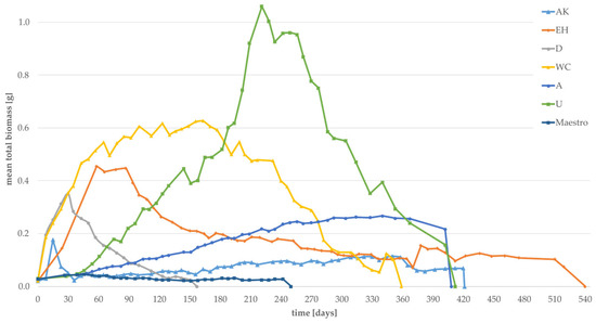 The mean total biomass of larvae grown on “improvable substrates” is provided in Figure 9. An initial biomass growth was recorded for eight substrates, although biomass rapidly decreased with time for all substrates (AK, EH, D, WC, A, U, Maestro). Only Maestro displays a slight increase, and the highest mean total biomass was recorded for Urtica, reaching 1.06 g on day 221 of the experiment. The mean total biomass for “not recommended” substrates are shown in Supplementary Materials (Figures S2 and S3). A high decrease in weight without any weight gain was recorded for those fourteen substrates.