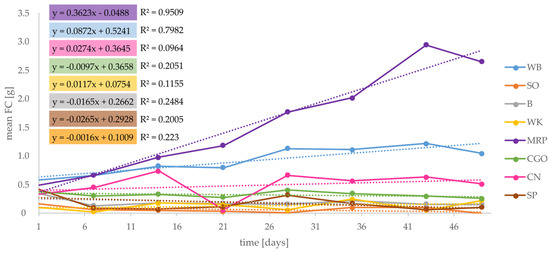 By subtracting the remaining substrate from the total amount of the substrate provided (initial weight of feed), the FC was calculated for suitable substrates. According to the results concerning this study, MRP showed the highest amount of consumed feed (Figure 10) and the sharpest increase in FC, followed by WB.