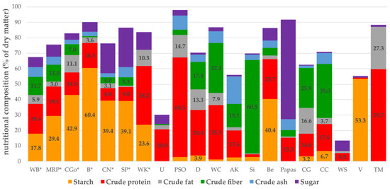 Nutrient composition of substrates in percent of dry matter (g/kg DM) and Tenebrio molitor larvae (TM = fed with wheat bran and carrots). * Substrates which were “successful” in feeding trials. Starch, protein, and fat content <3% are not indicated as number in this graph.