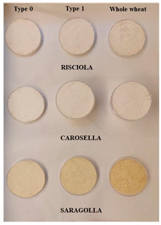 Three varieties of ancient grains (Risciola, Carosella, and Saragolla) were supplied by the Lucifero farm in Zungoli (Avellino, Italy) in September 2022. Risciola and Carosella are soft wheat varieties, while Saragolla is durum wheat. The different grains were grown in the same area and growing season to minimize variations due to agronomic and environmental variables. To obtain flour, the grains of each variety were milled with a stone mill, carefully controlling the temperature throughout the milling process at the Mulino Bencivenga farm in Alvignano (Caserta, Italy), and at different sifting degrees: whole wheat (100% sifting degree), type 1 (80 % sifting degree), and type 0 (72% sifting degree, [18]). After grinding, flour samples were stored at 4 °C until analyses (Figure 1).