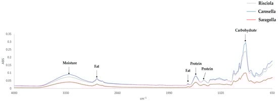 The ATR-FTIR spectra of Risciola, Carosella, and Saragolla wheat samples are shown in Figure 2. The spectra clearly show the infrared bands characteristic of organic functional groups associated with proteins, carbohydrates, lipids, and moisture content. In both durum and soft wheat samples, the spectral bands were observed at ~ 995 cm−1 (carbohydrates); ~1645 and ~1545 cm−1 (proteins); ~1742 and ~2927 cm−1 (fats); and ~3288 cm−1 (moisture) [32].