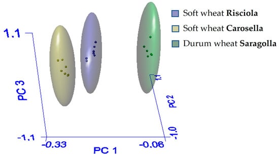 Durum and soft wheat samples show the same trend; nevertheless, the intensities of the ATR-FTIR bands of soft and durum wheat samples differed. Principal component analysis (PCA) was used to summarize the interrelationships between the physicochemical, nutritional, and structural properties of wheat samples based on their typology. As seen in Figure 3, the 3D-PCA scores plot generated with the Soft Independent Models of Class Analogy (SIMCA) method, produced three clusters.