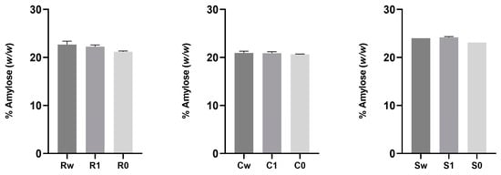 Percentage content of amylose (w/w) in flours obtained from ancient grains with different degrees of sifting (whole wheat, type 1, and type 0). Data are expressed as mean ± SD. The absence of symbols indicates non-significant differences between samples. Abbreviations: Rw: Risciola whole wheat; R1: Risciola 1; R0: Risciola 0; Cw: Carosella whole wheat; C1: Carosella 1; C0: Carosella 0; Sw: Saragolla whole wheat; S1: Saragolla 1; and S0: Saragolla 0.