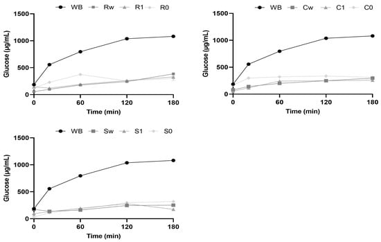 The calibration for extrapolation of concentrations from absorbances was conducted with solutions at known glucose concentrations. According to the equation described by Goñi et al. (1997) [28], the kinetics of starch hydrolysis were calculated: