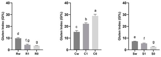The protein content is related to both genetic and non-genetic variables because nitrogen-rich soils may modify protein levels [40,41]. In Table 3, it is also visible that the percentage of proteins varied from 8.06 ± 0.01 (C0) to 10.54 ± 0.03 (R1) with 9.47 as the average. It was found that in Indian wheat cultivars, protein levels ranged from 8.65% to 12.02% and from 8.26% to 12.85% [42,43]. Moreover, in a comparison of commercial and monovarietal wheat flour from Peru, it was found that the average protein level was 9.64% and 8.02%, respectively [40].