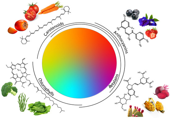 Among the compounds present in plants that show coloring properties, there are four main groups, anthocyanins, which have the widest range of colors presenting hues from blue to red; betalains, for which the color could be red-violet, yellow-orange color, and mainly pink; carotenoids, which can range from red to yellow; and chlorophylls, which are mostly green but also can present blue tones. All these compounds, in addition to their colorant capacity, exhibit different bioactive properties evidencing health benefits with their consumption [22].