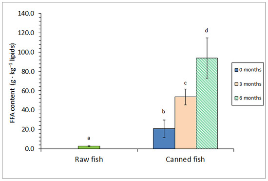 A comparison of the FFA content in raw fish and canned fish without a prior frozen period showed a strong formation of this kind of molecule resulting from the heating process (Figure 1). Furthermore, a subsequent increase (p < 0.05) in the FFA presence was proved by including a prior frozen storage; this increase was more important (p < 0.05) if the storage period was increased.