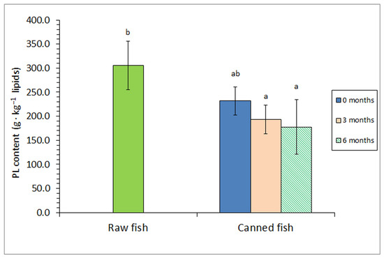 Phospholipid (PL) content of raw and canned horse mackerel previously subjected to different frozen storage times (0, 3, and 6 months). Mean values of four (n = 4) replicates. Standard deviations are denoted by bars. Different letters (a, b) denote significant differences (p < 0.05).