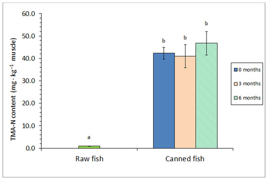 Trimethylamine (TMA) content of raw and canned horse mackerel previously subjected to different frozen storage times (0, 3, and 6 months). Average values of four (n = 4) replicates. Standard deviations are expressed by bars. Different letters (a,b) denote significant differences (p < 0.05).