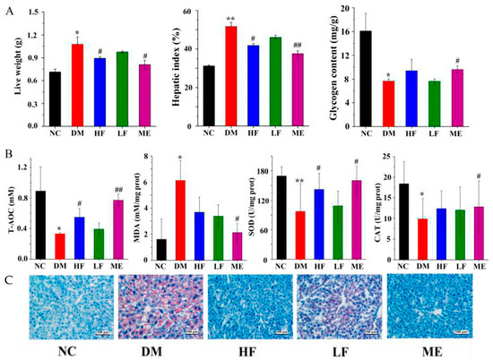 Protective effect of LJF on the liver: liver weight, hepatic index, and glycogen content (A); T-AOC, MDA, SOD, and CAT (B); histology analysis of liver by Oil-Red O dye staining (C). * p < 0.05 and ** p < 0.01 vs. NC group, and # p < 0.05 and ## p < 0.01 vs. DM group.