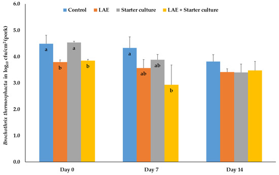 Mean and standard deviation values of the bacteria number of Brochothrix thermosphacta, inoculated on pork, depending on the day of storage in modified atmosphere (70% O2; 30% CO2) and the treatment after inoculation; Control = NaCl (0.9%) + Glycerol (3600 ppm); LAE = NaCl (0.9%) + LAE (4000 ppm); Starter culture = Staphylococcus carnosus and Lactobacillus sakei (106 cfu) + Glycerol (3600 ppm); LAE + Starter culture = LAE (4000 ppm) + Staphylococcus carnosus and Lactobacillus sakei (106 cfu); a,b columns with different letters on the same storage day differ significantly (p ≤ 0.05).