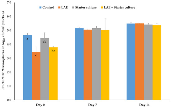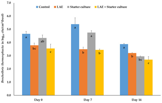 Mean and standard deviation values of the bacteria number of Brochothrix thermosphacta, inoculated on beef, depending on the day of storage in modified atmosphere (70% O2; 30% CO2) and the treatment after inoculation; Control = NaCl (0.9%) + Glycerol (3600 ppm), LAE = NaCl (0.9%) + LAE (4000 ppm); Starter culture = Staphylococcus carnosus and Lactobacillus sakei (106 cfu) + Glycerol (3600 ppm); LAE + Starter culture = LAE (4000 ppm) + Staphylococcus carnosus and Lactobacillus sakei (106 cfu); a,b,c columns with different letters on the same storage day differ significantly (p ≤ 0.05).