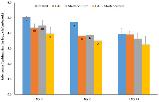 Mean and standard deviation values of the bacteria number of Salmonella Typhimurium, inoculated on pork, depending on the day of storage in modified atmosphere (70% O2; 30% CO2) and the treatment after inoculation; Control = NaCl (0.9%) + Glycerol (3600 ppm), LAE = NaCl (0.9%) + LAE (4000 ppm); Starter culture = Staphylococcus carnosus and Lactobacillus sakei (106 cfu) + Glycerol (3600 ppm); LAE + Starter culture = LAE (4000 ppm) + Staphylococcus carnosus and Lactobacillus sakei (106 cfu); a,b,c columns with different letters on the same storage day differ significantly (p ≤ 0.05).
