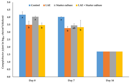 Mean and standard deviation values of the bacteria number of Campylobacter jejuni, inoculated on chicken meat, depending on the day of storage in modified atmosphere (70% O2; 30% CO2) and the treatment after inoculation; Control = NaCl (0.9%) + Glycerol (3600 ppm); LAE = NaCl (0.9%) + LAE (4000 ppm); Starter culture = Staphylococcus carnosus and Lactobacillus sakei (106 cfu) + Glycerol (3600 ppm); LAE + Starter culture = LAE (4000 ppm) + Staphylococcus carnosus and Lactobacillus sakei (106 cfu); a,b columns with different letters on the same storage day differ significantly (p ≤ 0.05).