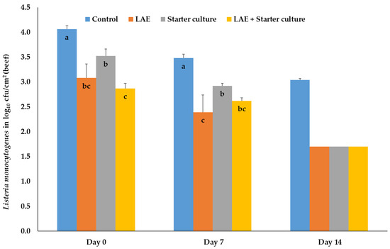 Mean and standard deviation values of the bacteria number of Listeria monocytogenes, inoculated on beef, depending on the day of storage in modified atmosphere (70% O2; 30% CO2) and the treatment after inoculation; Control = NaCl (0.9%) + Glycerol (3600 ppm), LAE = NaCl (0.9%) + LAE (4000 ppm); Starter culture = Staphylococcus carnosus and Lactobacillus sakei (106 cfu) + Glycerol (3600 ppm); LAE + Starter culture = LAE (4000 ppm) + Staphylococcus carnosus and Lactobacillus sakei (106 cfu); a,b,c columns with different letters on the same storage day differ significantly (p ≤ 0.05).