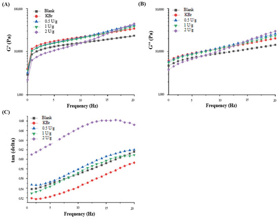 As illustrated in Figure 1, when 50 μg/g of KBrO3 or rBVL-MRL522 was introduced, the dough’s elastic and viscous moduli experienced corresponding increases. This observation suggests that rBVL-MRL522, acting as a dough strengthener, has a similar effect to the positive control, KBrO3. As the dosage of rBVL-MRL522 increased, the dough’s elastic and viscous moduli gradually increased. When the amount of rBVL-MRL522 added reached 2.0 U/g, the elastic modulus exhibited a 62.75% increase compared to the blank control, indicating that rBVL-MRL522 improved the dough’s ability to recover after deformation. The 59.35% increase in the viscous modulus suggests that rBVL-MRL522 enhanced the dough’s resistance to flow. The results for the loss tangent value (tan(delta)) indicated that as the addition of rBVL-MRL522 reached 0.5 and 1.0 U/g, tan(delta) gradually increased, signifying an increase in the proportion of polymers within the dough due to rBVL-MRL522. However, at a concentration of 2.0 U/g of rBVL-MRL522, tan(delta) first increased and then decreased, suggesting that excessive rBVL-MRL522 could affect the dough’s flexibility. Therefore, a careful addition of rBVL-MRL522 enhances the integrity of the dough’s gluten network, augments its flexibility, and significantly improves its resilience. These findings are consistent with the earlier flour quality tests, confirming that an optimal amount of rBVL-MRL522 enhances the dough’s strength. These results are consistent with the report of Manhivi et al. [32]. They observed the laccase-treated dough’s storage modulus (G’) and loss modulus (G″) significantly increased. The improvement in dough rheological properties may be attributed to the modification of proteins in the dough by disulphide bond formation, oxidative gelation of mucilage, as well as hetero-cross-linking between proteins and mucilage, which may strengthen the dough.