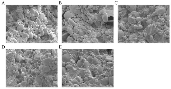 Comparison of microscopic analysis of doughs enhanced with different improvers. (A) control dough; (B) dough with 50 μg/g KBrO3; (C) dough with 0.5 U/g rBVL-MRL522 included; (D) dough with 1.0 U/g rBVL-MRL522 added; (E) dough with 2.0 U/g rBVL-MRL522 added.