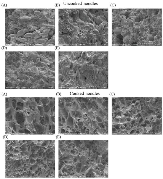 Comparative analysis of the microscopic structure in uncooked and cooked noodles. (A) control dough; (B) dough with 50 μg/g KBrO3 addition; (C) dough with 0.5 U/g rBVL-MRL522 incorporation; (D) dough with 1.0 U/g rBVL-MRL522 inclusion; (E) dough with 2.0 U/g rBVL-MRL522 addition.