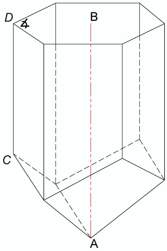 A three-dimensional view of the honeycomb cell representing conducted cell depth measurement along the A–B length and complementary measurements of the smallest side length (C–D) and the angle (∡) of the hexagonal cell.